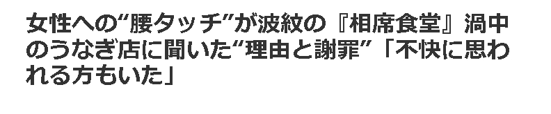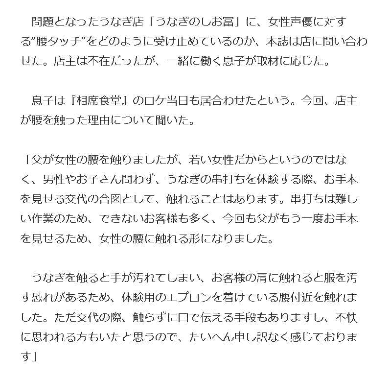 「父が女性の腰を触りましたが、若い女性だからというのではなく、男性やお子さん問わず、うなぎの串打ちを体験する際、お手本を見せる交代の合図として、触れることはあります。串打ちは難しい作業のため、できないお客様も多く、今回も父がもう一度お手本を見せるため、女性の腰に触れる形になりました。