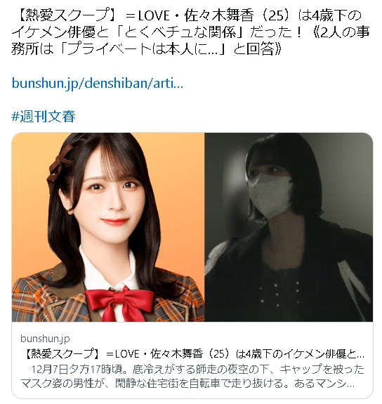 佐々木さんといえば、グループの中心メンバーで、一番人気と言われております。そんな彼女、先般、文春砲を喰らい、イケメン俳優との熱愛を報じられてしまいました・・
