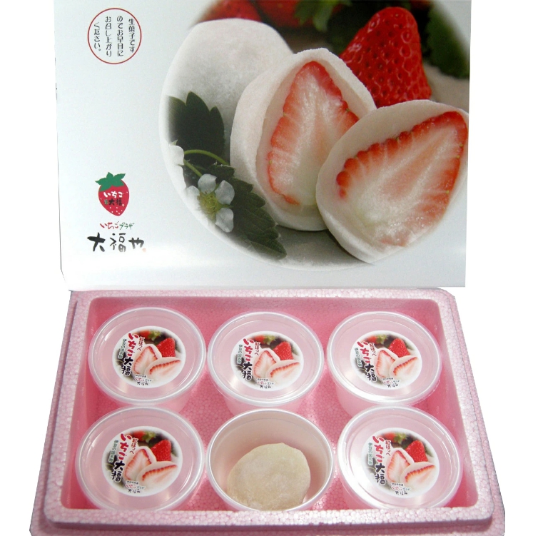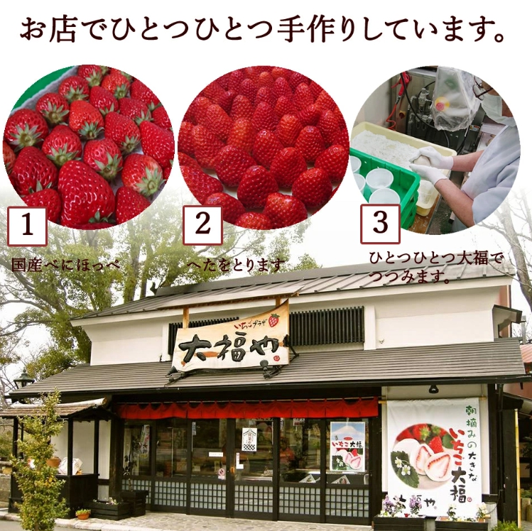 お店で和菓子職人がひとつひとつ手作りしたこだわりのいちご大福です。年間90万個、1日最高8000個の販売実績。